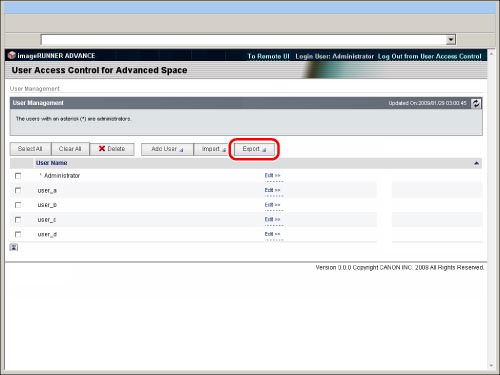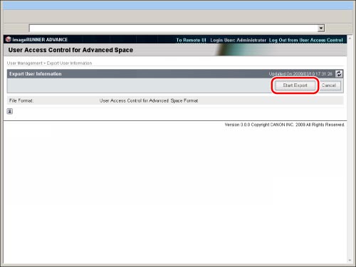 Export user information when you back up data on the Advanced Space to use on another imageRUNNER ADVANCE series machine. You can use the data stored on the Advanced Space if you import the user information into the other machine. For information on backing up/restoring stored data, see "Backing Up Stored Data."