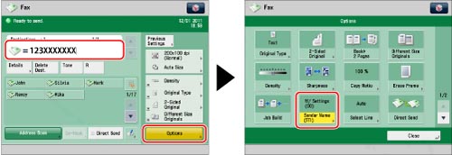 Specify the destination → press [Options] → [Sender Name (TTI)].