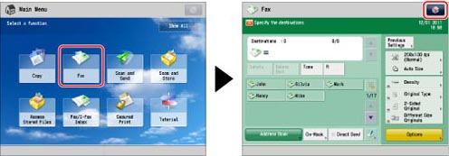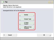 Two options shortcuts are displayed on the Fax Basic Features Screen. [2-Sided Original] and [Different Size Originals] are displayed as default. These shortcuts can be changed to functions that you frequently use.