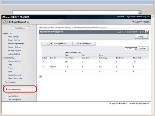 The Department ID Management settings are the same as those that you can access from the control panel of the machine by pressing [User Management] (Settings/Registration) → [Department ID Management]. For instructions on using the control panel to specify Department ID Management settings and more information on Department ID Management, see "Department ID Management."