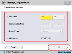 Press [Ethernet Driver Settings] for [Network] → specify the following items → press [OK].