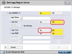 If you set <Use TLS> to 'On', you cannot set <Use TTLS> or <Use PEAP>.
