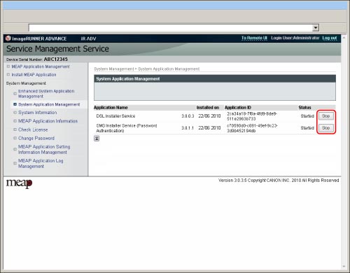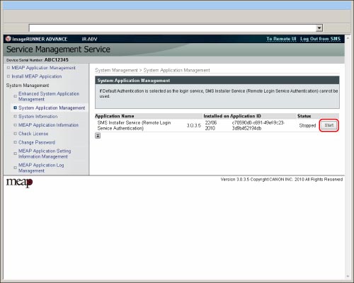 Click [Start] or [Stop] for the application that you want to start/stop.