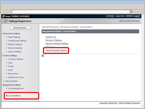 From the portal page of the Remote UI, click [Settings/Registration] → [License/Other] → [Register/Update Software].