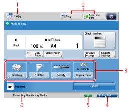 The progress of jobs and copy operations, and the status of devices and consumables are displayed here. Also, depending on the login service you are using, the Department ID or user name can be displayed.
