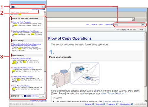 to display the search dialog box.You can also search by entering a keyword in the displayed dialog box. In addition, you can refine the search results by entering two or more keywords using the AND search. When entering keywords, enter a space between the keywords. Example: Toner Message (if you want to display pages which include words, "Toner" and "Message") |