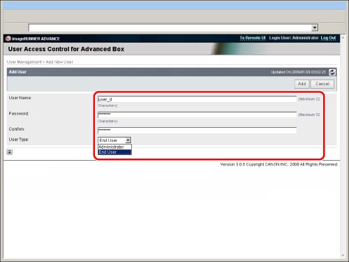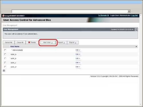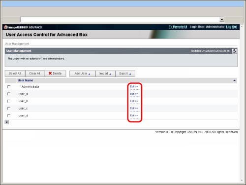 Only the Advanced Space administrator can register/edit the user information on the [User Management] page of [User Access Control for Advanced Space]. General users can only change their own password. (See "Editing User Information by General Users.")