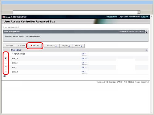 When you delete user information, it is recommended that you also delete any personal spaces that the user has created. The personal spaces that each user has created can be deleted using the Remote UI. For more information, see "Specifying the Advanced Space Settings."