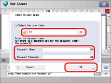 Select the mail box in which to store the file → enter a document name and document password in [Document Name] and [Document Password] → press [OK].