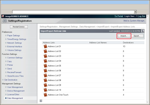 If you import the device settings, the Address List is also imported, causing the registered destinations to be deleted and overwritten with the destinations in the imported file.