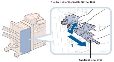 2. Pull the stapler unit of the saddle stitcher unit towards you, and then push it up. |