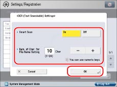 Press [On] for <Smart Scan> → press [-] or [+] for <No. of OCR File Name Characters> to set the number of characters for the file name → press [OK].