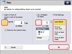 If you are using paper that already has printing on it (e.g., company logo) as your sheet insertion, then you must select [Leave Blank]. Otherwise, the machine will copy on the preprinted paper.