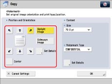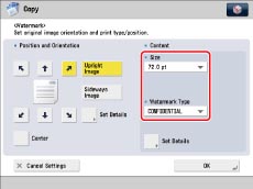 You can also select text that has been registered in [Register Characters for Page No./Watermark]. (See "Registering/Editing/Deleting User-Defined Text for Page Numbers and Watermarks.")