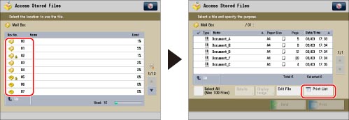 Even if you sort the list of stored files by pressing [Name] or [Date/Time], the list of files will be printed in the order that the files were stored in the mail box.