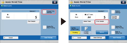 [Print Sample] appears only if you set to make multiple prints of your original with [Collate (Page Order)], [Offset], [Rotate 90 Degrees], [Staple], [Add Cover], [Insert Sheets], or [Booklet].
