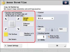 If you set <Number Option> to 'On' in [Copy Set Numbering Option Settings], [Full Surface] and [Numbers in 5 Locations] are grayed out and cannot be selected. (See "Copy Set Numbering Options.")