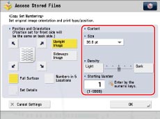 If you set <Number Option> to 'On' in [Copy Set Numbering Option Settings], you can set the copy set number size to [10.5 pt], [12.0 pt], or [14.0 pt]. (See "Copy Set Numbering Options.")