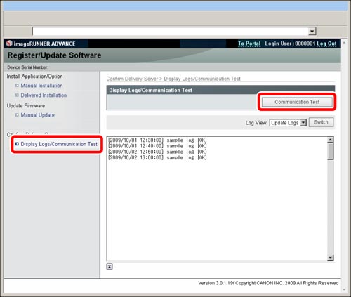 You can check whether communication can be performed with the delivery server, using the touch panel display or the Remote UI. Perform this procedure when you connect the machine to an external network.