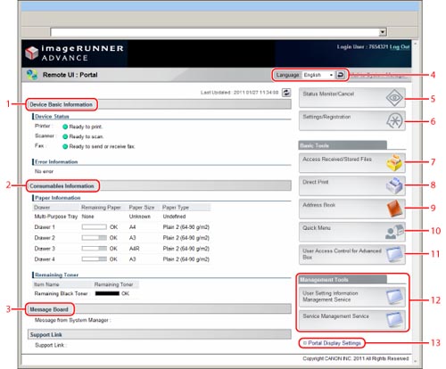 You can change the language displayed on the screen by selecting the desired language on the portal page, regardless of the language used on the touch panel display of the machine.