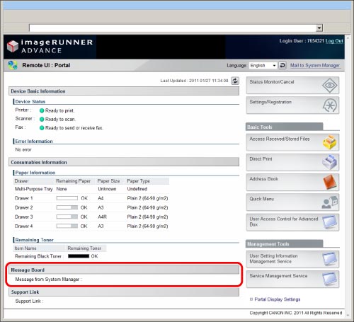 Messages are displayed at all times on the portal page of the Remote UI. This message board is best suited when you want to send messages to the Remote UI users.