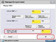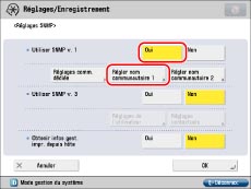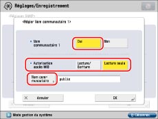 Appuyer sur [Oui] pour <Utiliser SNMP v. 1> → [Réglages comm. dédiée]. Appuyer sur [Oui] pour <Communauté dédiée> → [Lecture/Ecriture] pour <Autorisation accès MIB>.