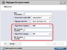Sélectionner [MD5] ou [SHA1] dans la liste déroulante <Algorithme d'authent.> → définir [Mot de passe authentif.].
