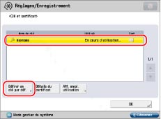 Il est possible de vérifier où est utilisée une paire de clés en sélectionnant une paire de clés ayant "Utilisé" comme <Statut> sur l'écran Clé et certificat, puis en appuyant sur [Aff. emplac. d'utilisation].