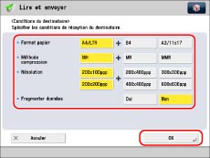 Définir les conditions de réception en fonction des spécifications de la machine du destinataire. Une erreur de transmission peut survenir si les conditions définies ne sont pas prises en charge par la machine du destinataire.