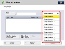 Dérouler la liste → sélectionner une liste d'adresses dans l'une des listes d'adresses 1 à 10.