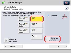 Si PDF (Tracer&Lisser), PDF (Compact) ou XPS (Compact) est défini comme format de fichier standard et que l'on envoie des documents par fax ou par I-Fax, un message peut s'afficher pour demander le changement du format de fichier. Dans ce cas, sélectionner un format de fichier autre que PDF (Compact), XPS (Compact) ou PDF (Tracer&Lisser). Pour plus d'informations sur la définition/la modification du mode standard, voir [Modifier réglages par défaut]. (Voir "Modification des réglages par défaut de l'envoi".)