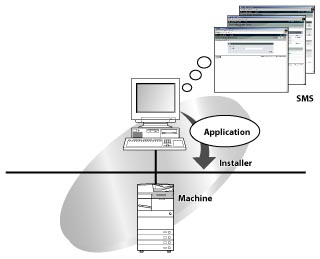 Le logiciel SMS (Service Management Service) permet d'accéder à des machines Color imageRUNNER/imageRUNNER, imagePRESS ou imageRUNNER ADVANCE (appelées "machines" dans le présent manuel) via un réseau et depuis un navigateur Web, mais aussi d'installer et de gérer les applications MEAP. Le logiciel de serveur Web nécessaire pour l'utilisation de SMS est inclus. Un navigateur Web et une connexion réseau entre l'ordinateur et la machine suffisent pour pouvoir utiliser SMS. Pour pouvoir exploiter SMS, la machine doit être connectée au même réseau que l'ordinateur utilisé. SMS vous permet d'exécuter les opérations suivantes :