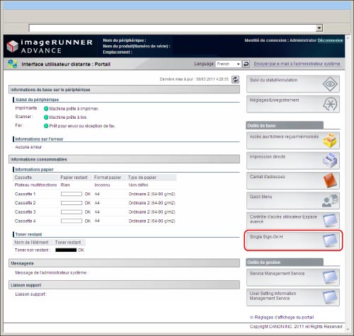 En cas de connexion en tant qu'administrateur système (Administrator), veiller à se déconnecter avant de fermer SSO-H. Si le navigateur Web est fermé sans qu'il y ait eu déconnexion, il est impossible d'utiliser SSO-H pendant un certain temps, même avec une reconnexion en tant qu'administrateur système (Administrator).