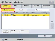 Annule la tâche sélectionnée. [Arrêt] s'affiche si une tâche est sélectionnée. Appuyer sur [Arrêt] → [Oui] pour annuler la tâche.