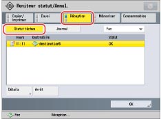 Affiche des informations détaillées relatives à la tâche sélectionnée. Vérifier les informations détaillées → appuyer sur [OK] pour revenir à l'écran Réception.
