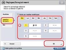 Si [Spécifier les jours] est sélectionné, choisir le jour de la semaine ([Dim] à [Sam]) → sélectionner un chiffre ([1] à [5]).