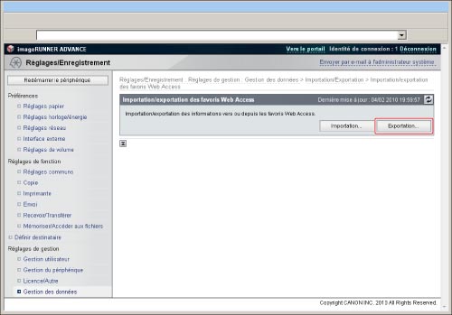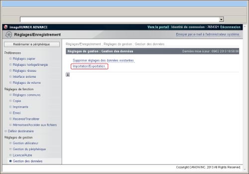 Cliquer sur [Réglages/Enregistrement] → [Gestion des données] → sélectionner [Importation/Exportation].