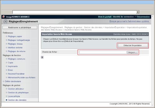 Lors de l'importation de favoris à partir d'un fichier d'ordinateur, les favoris déjà enregistrés dans la machine sont écrasés.