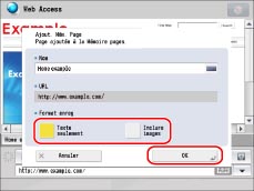 Le nom et l'URL peuvent être enregistrés. Si l'URL est enregistrée, le contenu de l'écran enregistré ne change pas. L'écran affiché actuellement est enregistré sous forme de mémoire pages.