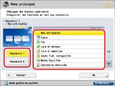 Si le nombre de boutons de fonction est supérieur à la valeur définie sous <Réglages affichage bouton menu principal>, les boutons supplémentaires sont affichés sur le deuxième écran du Menu principal. L'écran du Menu principal peut contenir 16 boutons au maximum.