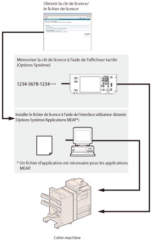 Lors du téléchargement des manuels et des logiciels des périphériques système ou applications MEAP, préparer le certificat du numéro d'accès à la licence inclus dans le module. Si aucun manuel n'est proposé au téléchargement, voir la description de la fonction dans le présent manuel.
