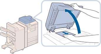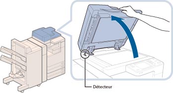 Sur cette machine, le chargeur est équipé d'un détecteur d'ouverture/fermeture (encerclé dans l'illustration ci-dessus). Pour déposer les originaux sur la vitre d'exposition, soulever le chargeur d'environ 300 mm de manière à en écarter le détecteur. Si le détecteur ne s'écarte pas du chargeur, le format des originaux risque de ne pas être détecté correctement.