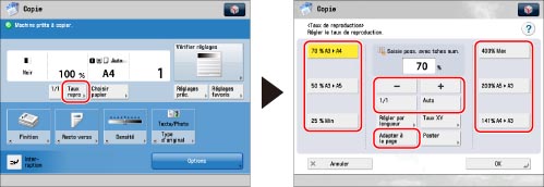 Si [Auto] est activé, sélectionner un format papier manuellement. Si l'on ne sélectionne pas le format papier, le taux de reproduction est défini en fonction de celui qui est chargé dans la cassette n° 1 ou le magasin papier droit de la machine.