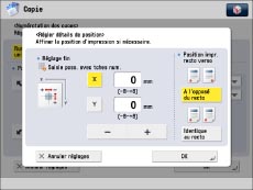 Si le même emplacement d'impression du numéro est sélectionné pour n'importe quelle combinaison de deux modes parmi les suivants : [Numérotation jeux copies], [Filigrane] ou [Date d'impression], un message demandant la confirmation s'affiche lorsque l'on appuie sur