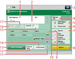 Pour envoyer des documents directement au destinataire. Si Envoi direct n'est pas sélectionné, la machine utilise Envoi depuis la mémoire. (Voir "Basculement en mode Envoi direct".)