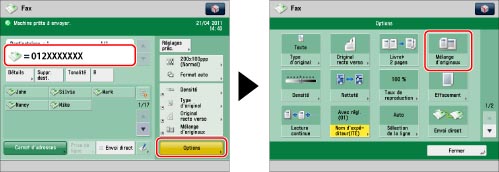 Spécifier le destinataire → appuyer sur [Options] → [Mélange d'originaux].