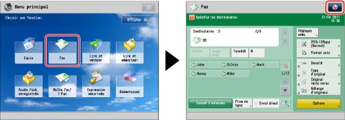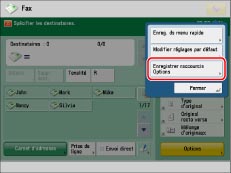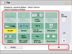 Deux raccourcis des options sont affichés dans l'écran des fonctions de base du mode Fax. Les options définies par défaut sont [Original recto verso] et [Mélange d'originaux]. Ces raccourcis peuvent être modifiés pour des fonctions utilisées fréquemment.