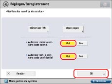 Les paramètres <Autoriser impressions sans code confid.> et <Autoriser lect. à dist. sans code confidentiel> ne sont activés que si la machine propose les fonctions d'impression et de lecture à distance.