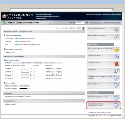 Pour définir chaque paramètre du service de gestion des informations de réglage utilisateur, il est nécessaire d'accéder à la machine, puis de s'y connecter à partir du navigateur Web. Cette section décrit la procédure d'accès à la machine à partir de la page de portail de l'interface utilisateur distante.