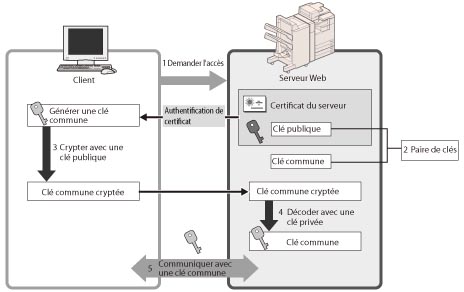 Il est possible de disposer d'une communication cryptée sûre lorsque l'utilisateur accède à la machine via un navigateur Web en installant un certificat de serveur sur la machine. Avec les communications SSL, la clé commune qui peut uniquement être utilisée par l'utilisateur et la machine est générée à l'aide du certificat de serveur et de la clé publique. Il est ainsi possible d'éviter l'interception et le vol de données. Voir "Réglages de la biclé et du certificat du serveur pour les communications SSL cryptées" et "Définition de la paire de clés utilisée avec les communications cryptées SSL".